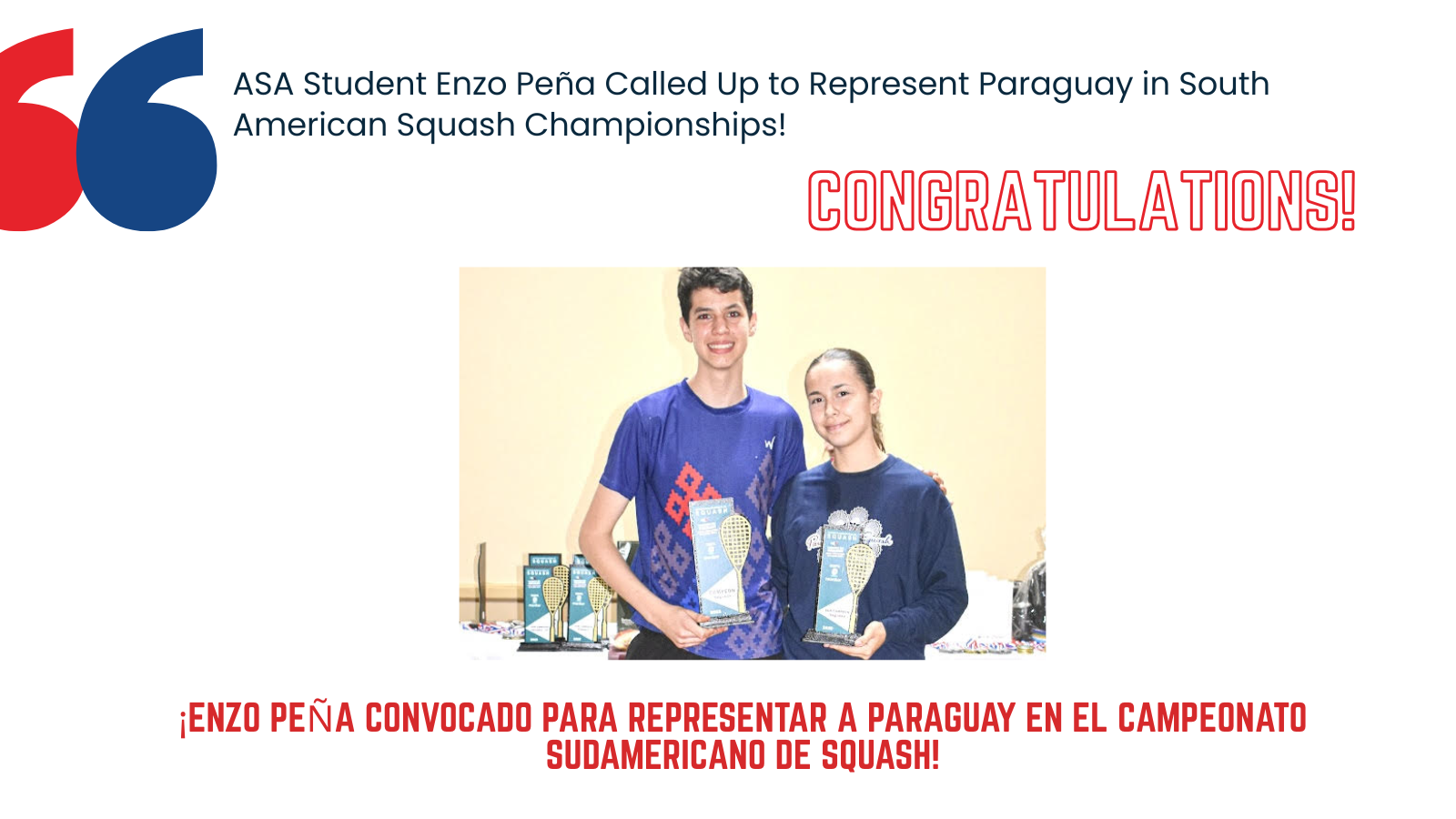 ASA ninth-grade student, Enzo Peña, has been officially called up to represent Paraguay in the upcoming South American Squash Championships in February 2026. Enzo (15) will compete in the prestigious Under-17 category. As a key part of his preparation...