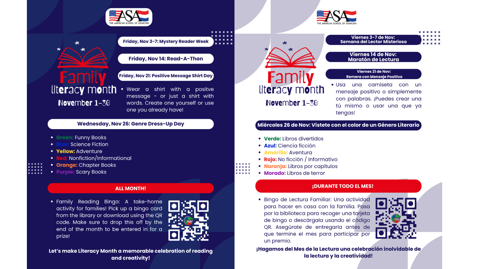 ASA will wrap up Family Literacy Month next Wednesday, November 26th, with a fun, school-wide activity: Genre Dress-Up Day. Students (and participating families) are invited to come to school wearing the color that represents their favorite book genre: Green:...